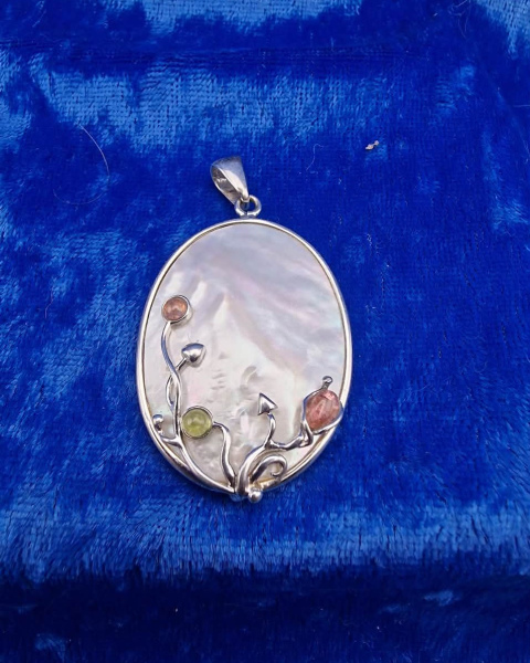 Pendant large Mother Of Pearl pink and green tourmaline cabochon