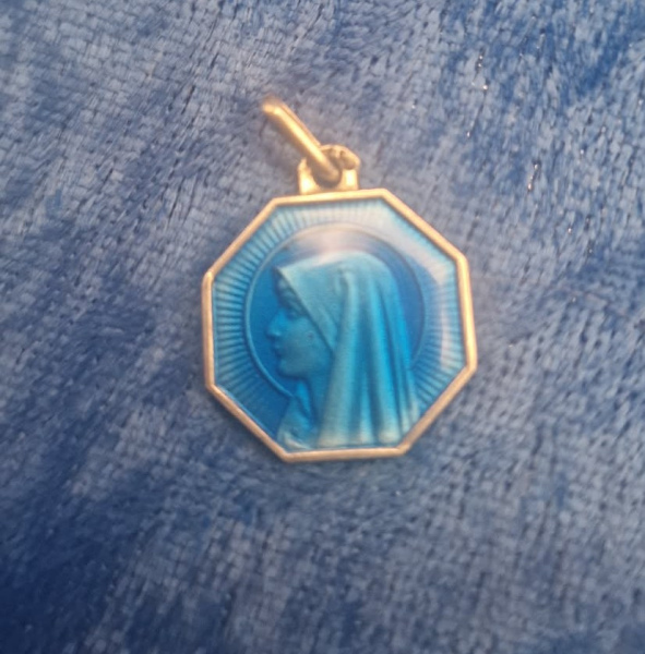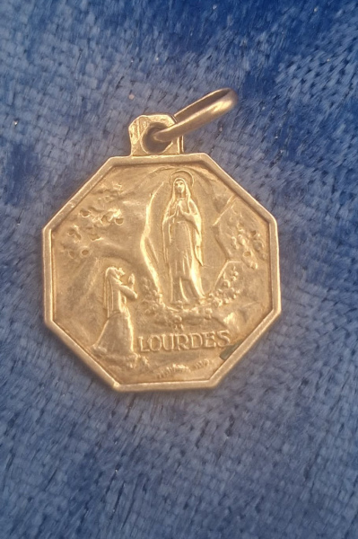 Lourdes medal pendant, a religious medal depicting the apparition of the Virgin Mary to Saint Bernadette Soubirous at the Grotto of Massabielle in Lourdes, France